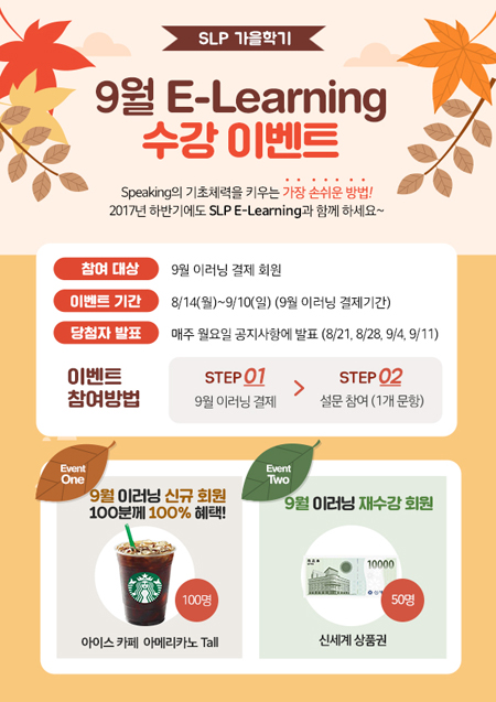 이번 이벤트는 SLP 9월 이러닝 결제 회원을 대상으로 지난 14일부터 시작해 오는 9월 10일까지 약 한 달간 진행되며, 이러닝 결제 후 간단한 설문 조사를 완료하면 자동으로 이벤트에 참여할 수 있다.