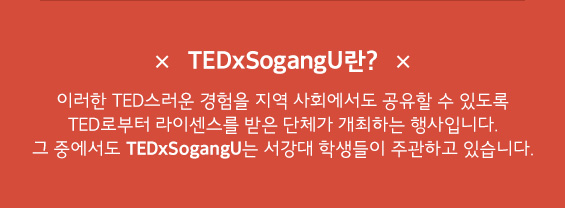 TEDxSogangU란? 이러한 TED스러운 경험을 지역 사회에서도 공유할 수 있도록 TED로부터 라이센스를 받은 단체가 개최하는 행사입니다. 그 중에서도 TEDxSogangU는 서강대 학생들이 주관하고 있습니다.