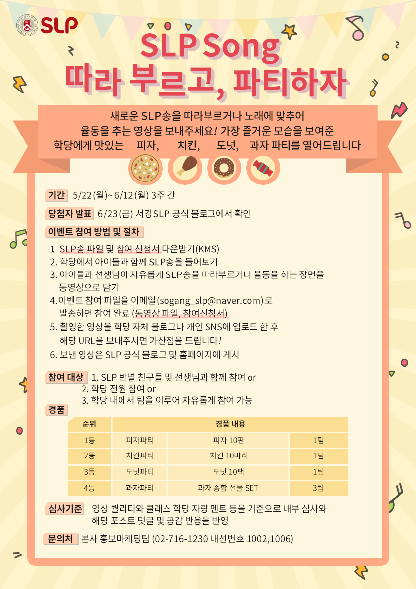 SLP Song 따라 부르고 파티하자 이벤트! 새로운 SLP Song을 따라부르거나 노래에 맞추어 율동을 추는 영상을 보내주세요! 가장 즐거운 모습을 보여준 팀에게 피자, 치킨, 도넛, 과자 파티를 열어드립니다 ♥ 자세한 사항은 블로그를 참고해주세요!