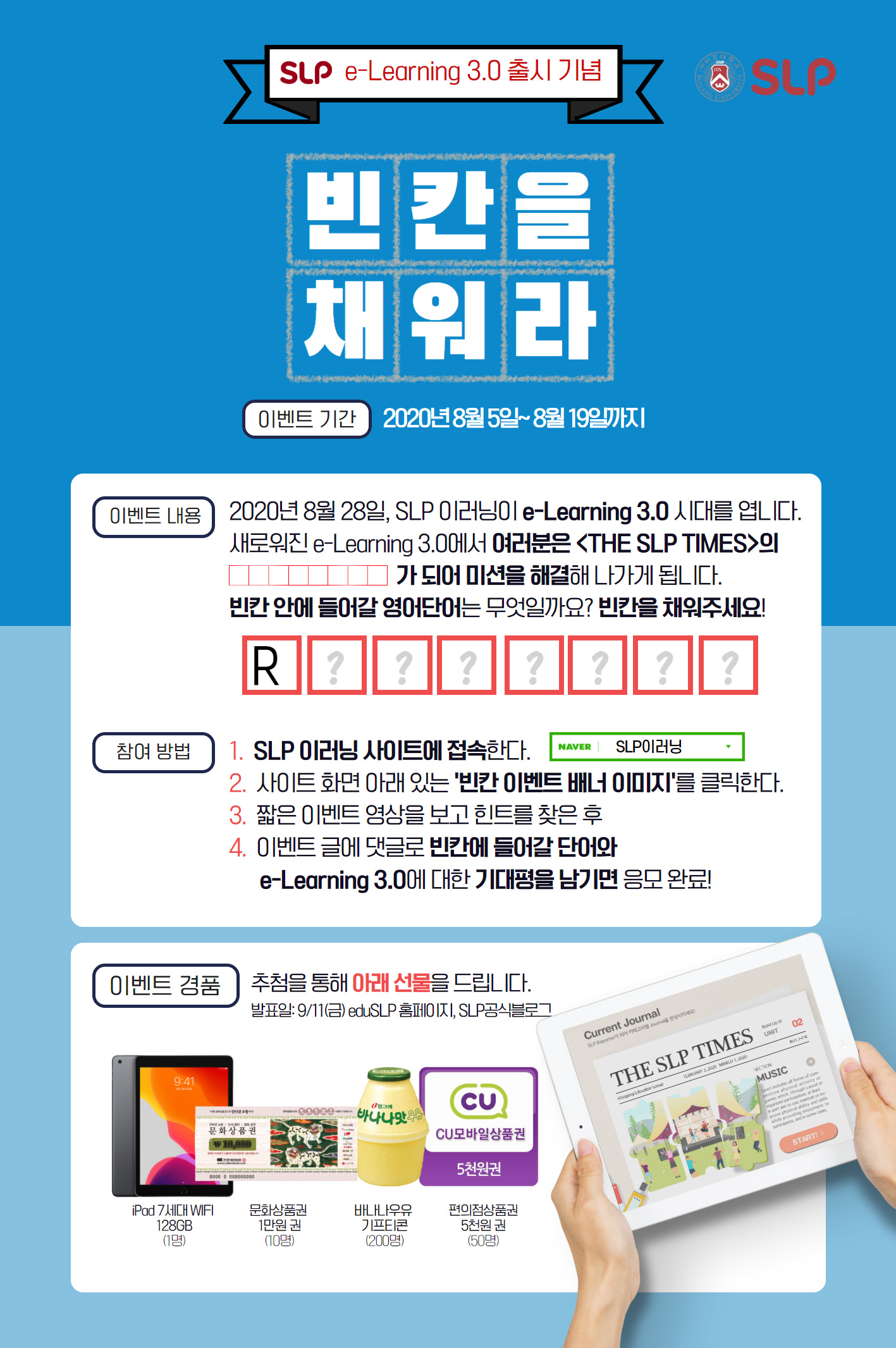 SLP 이러닝 3.0 출시기념 이벤트 "빈칸을 채워라!" (8/5~8/19)작성일시2020.08.06 |