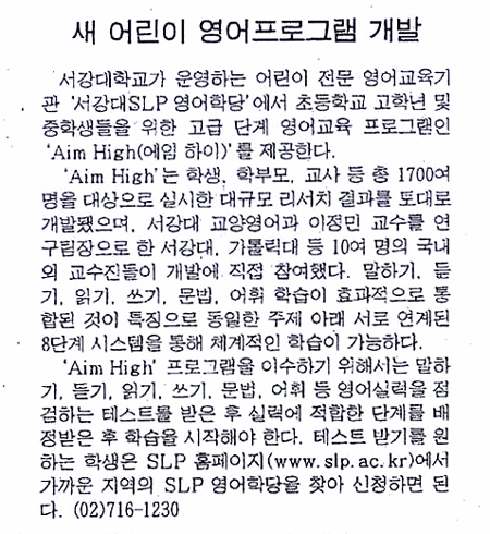 <동아일보 - SLP 관련기사>말하기-듣기 등 8단계 통합 : 서강 SLP 영어학당 '에임 하이'