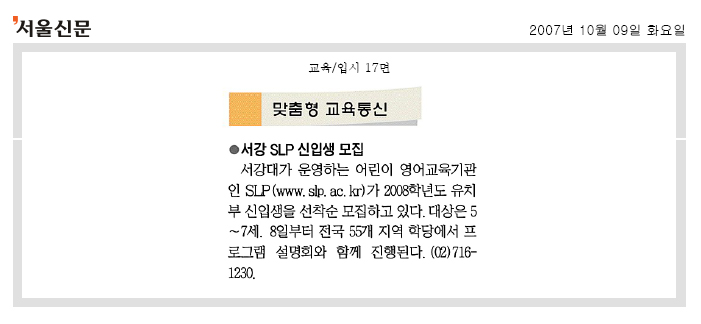 10월 9일 서울신문에 게재된 SLP 유치부 원생 모집 단신입니다.