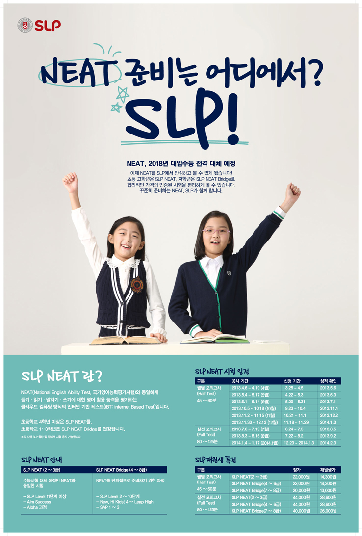 자신의 영어 실력을 객관적으로 확인하고 싶은 학생, 국가영어능력평가(NEAT)를 미리 준비하길 원하는 학생은 SLP NEAT를 응시해 보시기 바랍니다.
