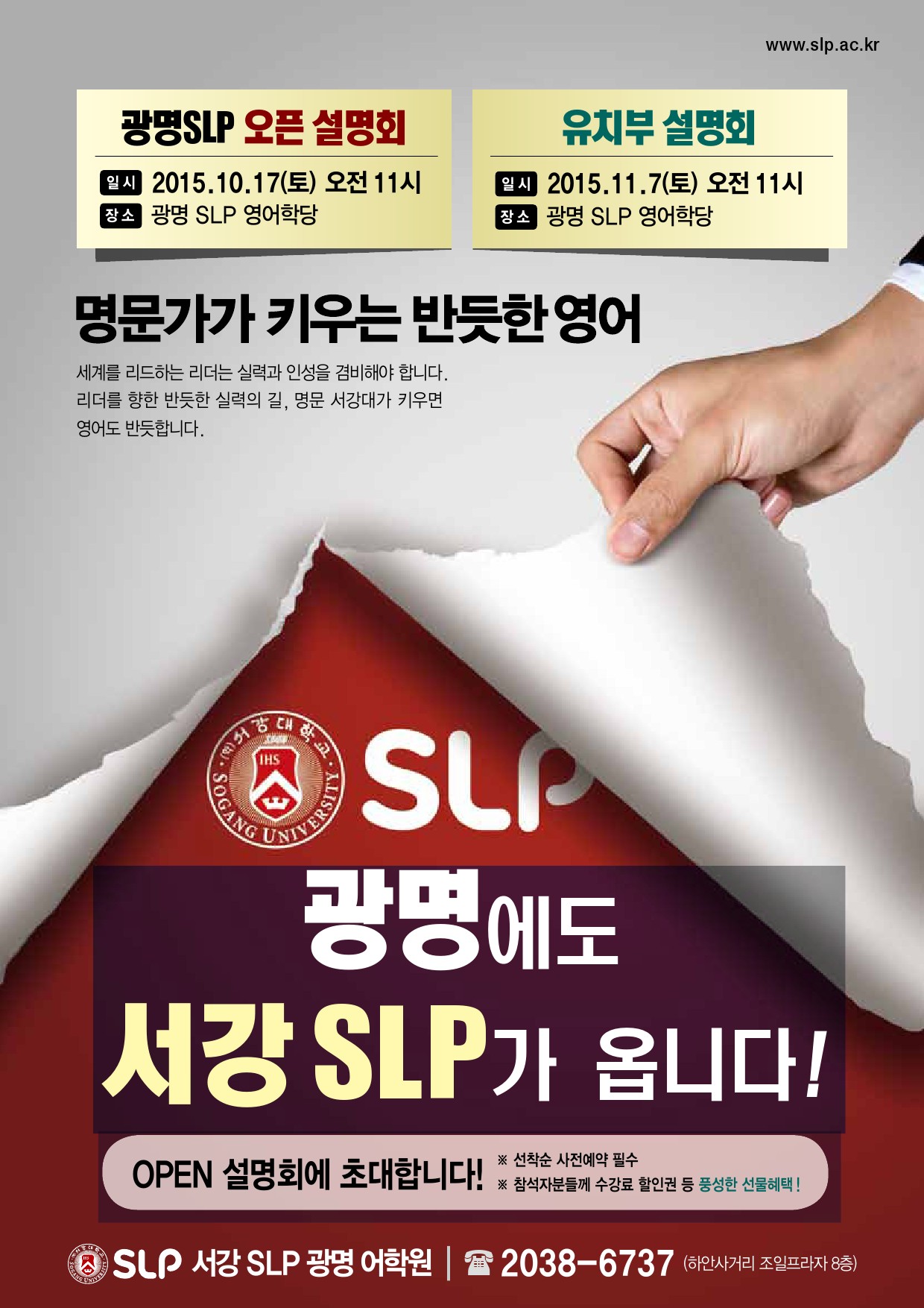 2015년 11월, 해와 달이 비치는 살기 좋은 도시 광명시에 SLP가 다시 오픈합니다. 광명시에 거주하는 많은 학부모들의 SLP 재오픈에 대한 지속적인 관심과 문의가 있어 왔던 바, 이번 광명 SLP 개원 소식은 학부모들 뿐만 아니라 SLP 자체적으로도 특히나 반가운 소식입니다. 탄탄한 교육 경력과 실력을 겸비한 교사진 및 운영진을 구성하고, 아이들을 위한 차별화된 교육 환경 조성을 위해 오랜 기간 개원을 준비한 광명SLP는 이번 개원 설명회를 통해 서강SLP의 교육철학과, 어린이 영어교육에 대한 비젼을 제시할 예정입니다. 광명 SLP의 개원으로 전국 68곳의 영어학당에서 SLP의 차별화된 영어교육을 만나실 수 있습니다. 광명SLP에서 장차 대한민국을 이끌 반듯한 인재들을 길러내길 기대합니다. ◈ 오픈설명회 일정 : 10월 17일(토), 11시 ~ 12시, 광명 SLP 강당 ◈ 문의 : 02-2038-6737 ![]() |
